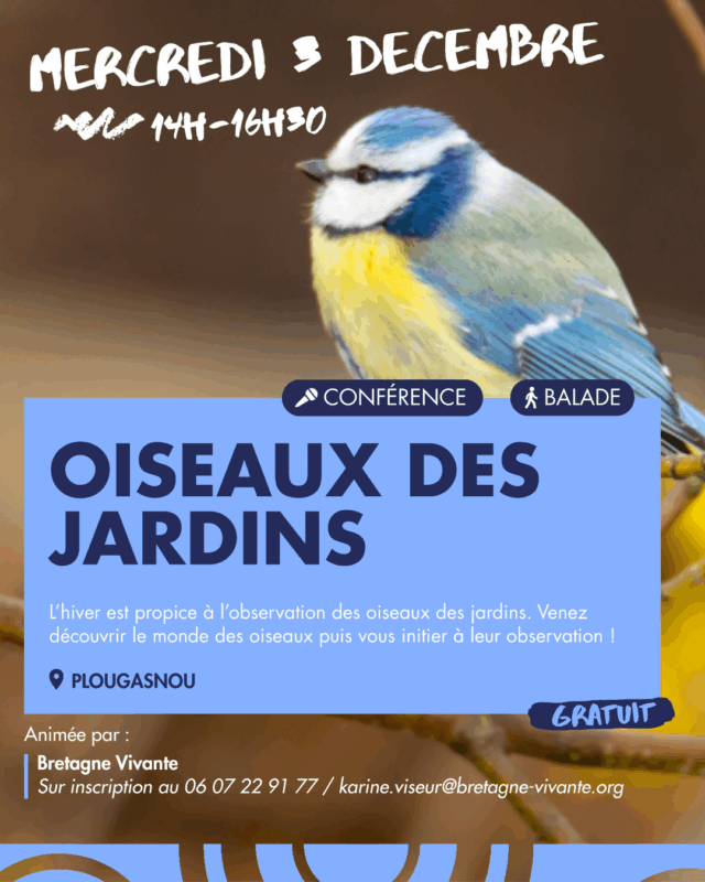 Dans le cadre du programme d’animations Trame Verte et Bleue, une sortie nature intitulée “Oiseaux des jardins” sera proposée par An Dour mercredi 3 décembre, de 14h à 16h30, sur la commune de Plougasnou.