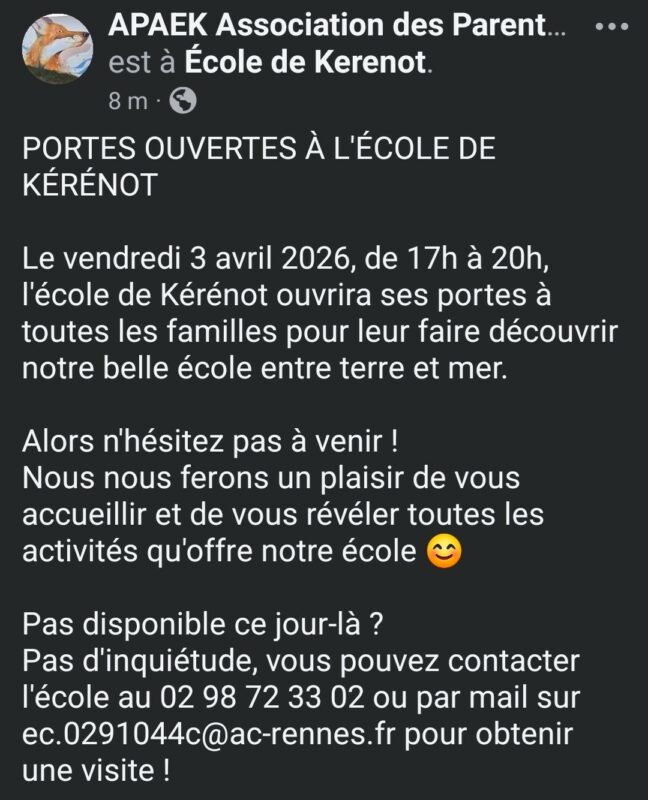 L’école de Kérénot organise une journée portes ouvertes vendredi 3 avril de 17h à 21h.